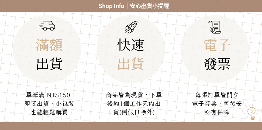 2.因包裝人力成本考量,賣場低消150元才出貨(不包含運費)。
